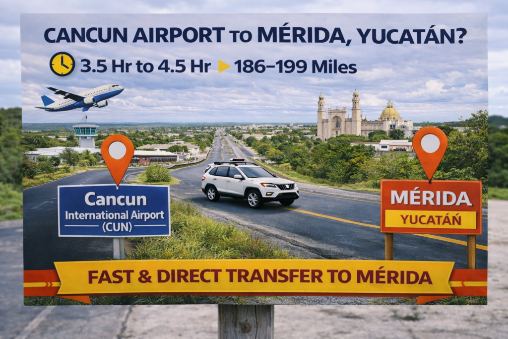 Arriving at Cancun International Airport (CUN) and traveling to Mérida, Yucatán? Below you’ll find the approximate distance, average travel time,